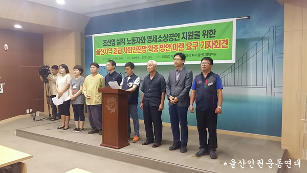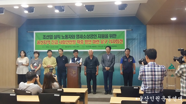 내용 : 울산인권운동연대가 참가하는 조선산업 대량해고,구조조정 저지 울산지역 대책위에서는 시청 프레스센터에서 조선업 실직 노동자와 영세소상공인 지원 울산지역 긴급 사회안정망 확충 방안 마련을 요구하는 기자회견을 열었습니다. 울산의 중요 산업인 조선산업의 구조조정과 대량해고의 문제가 지역사회를 강타하고 있습니다. 정부와 지방자지단체에서는 이런 어려움을 해결할 제도나 방법을 내놓고 있지 않습니다. 이에 조선산업 대량해고,구조조정 저지 울산지역 대책위에서는 실직노동자와 영세소상인 지원 정책 몇가지 방안을 제안하고 요구하기 위해서 기자회견을 개최하였습니다.