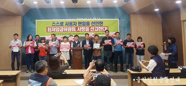 일시 : 7월 18일 (월) 장소 : 울산광역시청 프레스센터 내용 : 최저임금?현실화?울산연대회의는 사용자?편임을 보여준?최저임금위원회의?최저임금 결정은 문제가 있었고?최저임금위원회는?구조적?개선이 필요하다는 기자회견을 열었습니다. 지난 16일 최저임금은 시급 6,470원으로 결정되었습니다. 최저임금 현실화 울산연대회의는 최저임금위원회의 구조상의 문제점으로 제도개선에 즉각 나설 것이라고 했습니다.