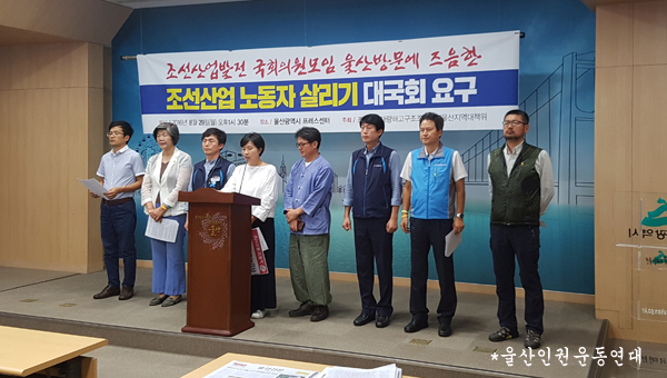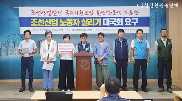 내용 : 울산광역시청 프레스센터에서 조선산업대량해고구조조정저지울산지역대책위는 조선산업발전 국회의원모임 울산방문에 조선산업 노동자 살리기 대국회를 요구하는 기자회견을 열었습니다. 조선산업발전과 조선산업 노동자의 고용안정을 위한 국회의원 모임(약칭 조선산업발전국회의원모임)이 8월 29일(월) 현대중공업과 현대미포조선 경영진과 노동조합 간담회를 진행하기 위해 울산을 방문합니다. 이에 조선산업대량해고구조조정저지울산지역대책위는 대국회를 상대로 다음과 같은 요구를 했습니다.