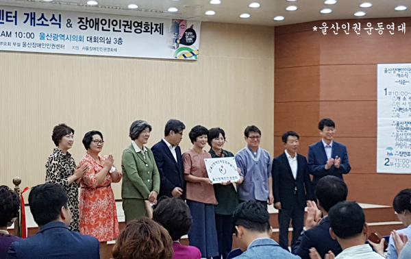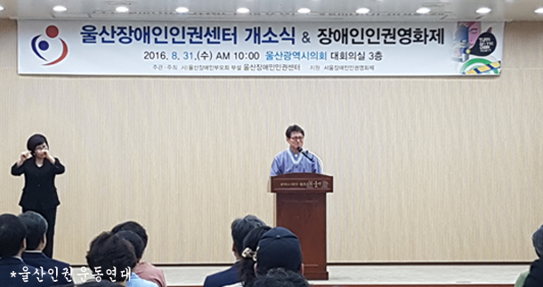 내용 : 울산광역시의해 대회의실에서 사)울산장애인부모회 부설 울산장애인인권센터가 울산장애인인권센터개소식 그리고 장애인인권영화제를 열었습니다. 울산장애인인권센터에서는 장애인 인권침해와 차별에 대해 신고를 받고 상담을 진행하고 장애를 이유로 인권침해나 차별을 당한 장애인의 권리회복을 지원합니다. 그리고 울산장애인인권교육팀은 장애에 대한 인식개선을 위해 장애 관련 교육을 진행합니다. 개소식이 끝난 뒤 이어서 장애인 인권영화제가 시작되었습니다. '차이가 차별이 되지 않는 세상을 위하여'라는 주제로 만든 4편의 영화를 상영하고 관객과의 대화를 진행했습니다.
