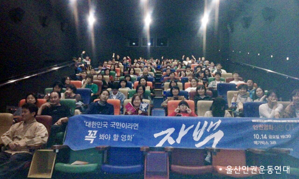 내용 : 울산인권운동연대는 제15회 울산인권학교 첫번째 강좌를 맞이하여 울산 성남동 메가박스3관에서 인권영화 '자백'을 상영했습니다. 영화'자백'은 한국의 액션 저널리스트 최승호 감독이 한국, 중국, 일본, 태국 등 4개국을 넘나들며 펼친 40개월간의 추적 끝에 드러나는 스파이 조작 사건의 실체를 담은 미스터리 액션 추적극입니다. 이날 영화관람에 참여하신분들의 성원에 힘입어 인권영화상영은 잘 마무리 되었습니다.