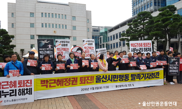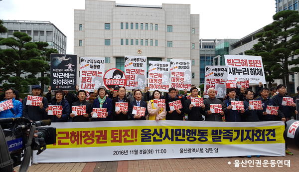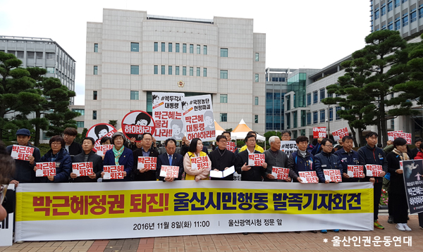 내용 : 울산지역 진보제정당 및 시민사회단체는 박근혜정권 퇴진! 울산시민행동 출범 기자회견을 열었습니다. 박근혜정권 퇴진 울산시민행동은 첫째로 박근혜 대통령이 즉각 퇴진해야하고, 둘째로 국정유린 사건에 대한 성역 없는 수사와 특검이 실시되어야 하고, 셋째로 박근혜 대통령이 국기문란 비선실세를 비롯한 책임을 지고, 새누리당이 국민 앞에 석고대죄하고 자진해산해야 한다고 요구했습니다.